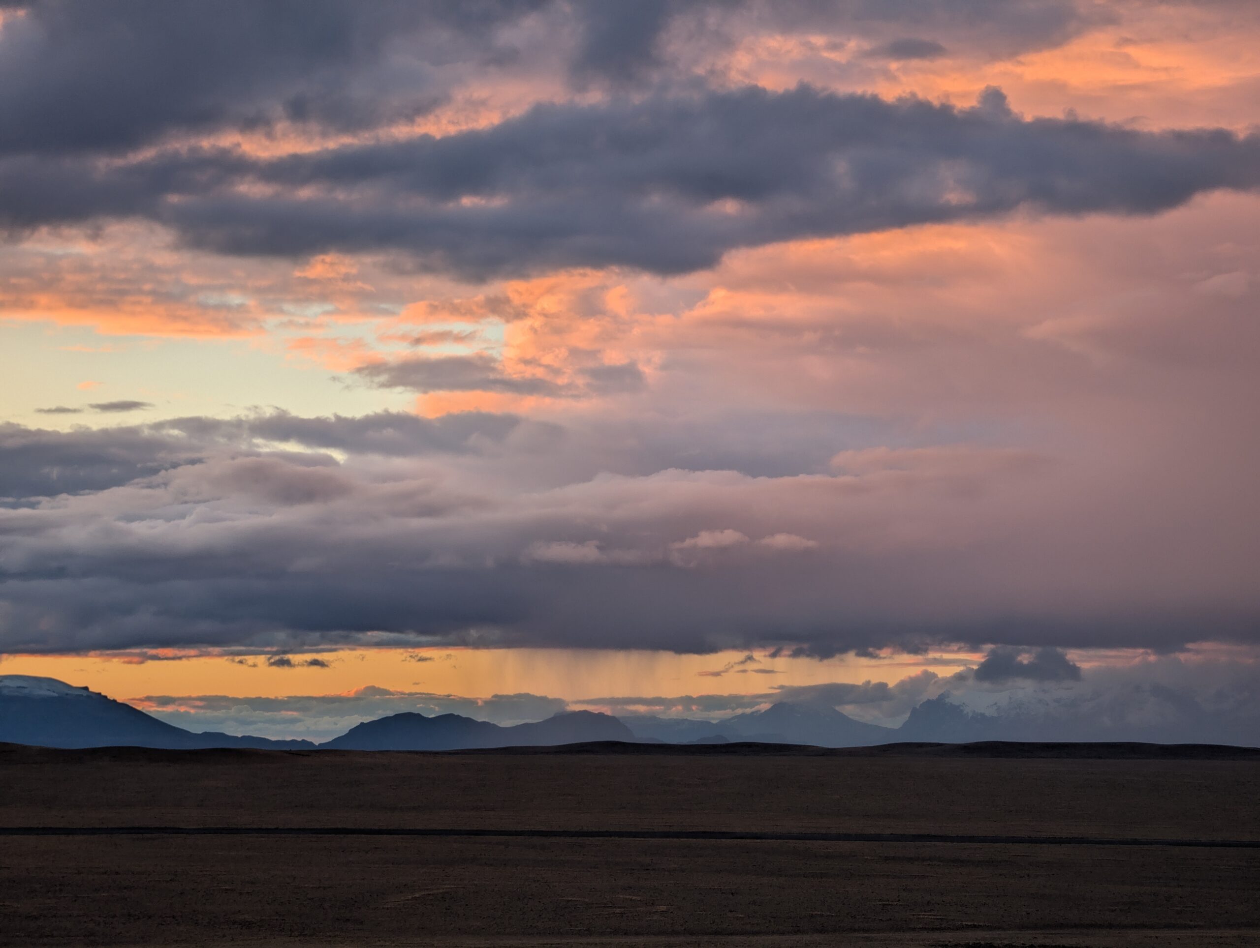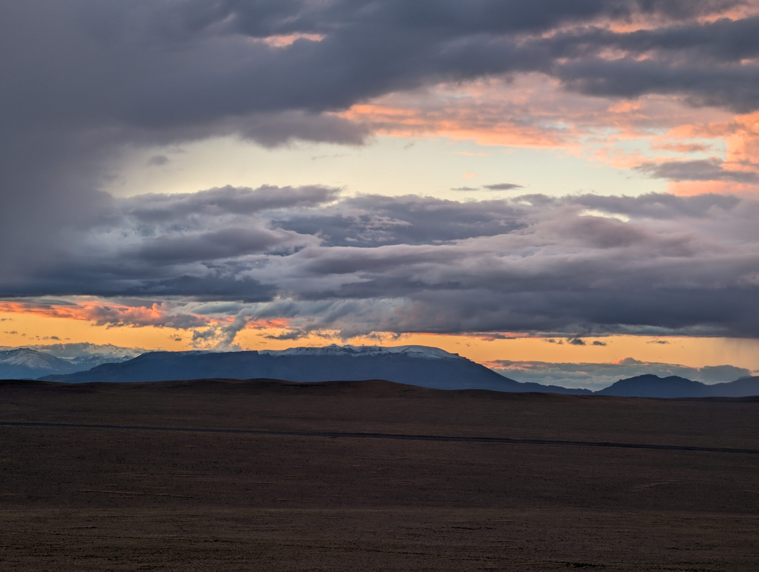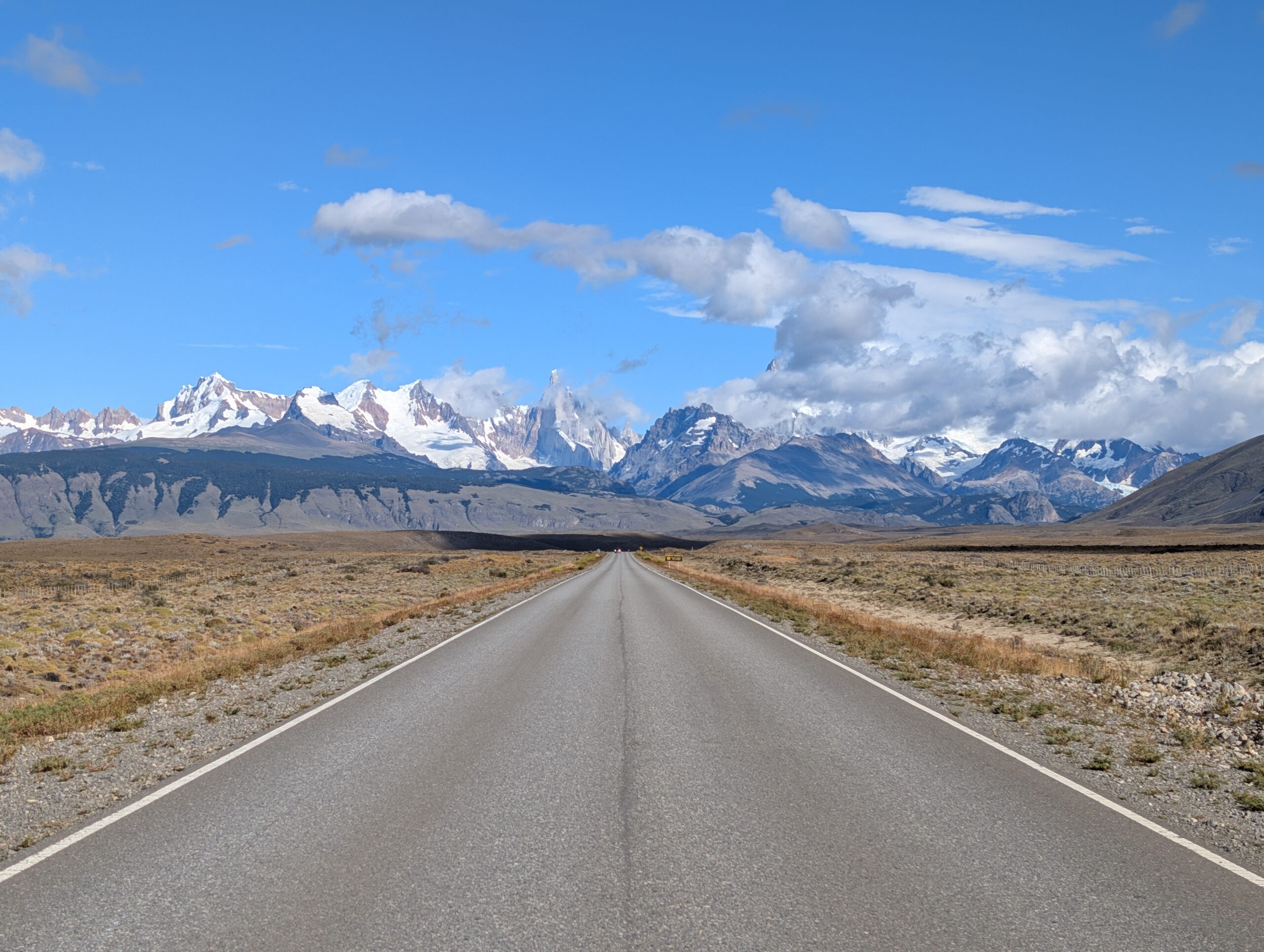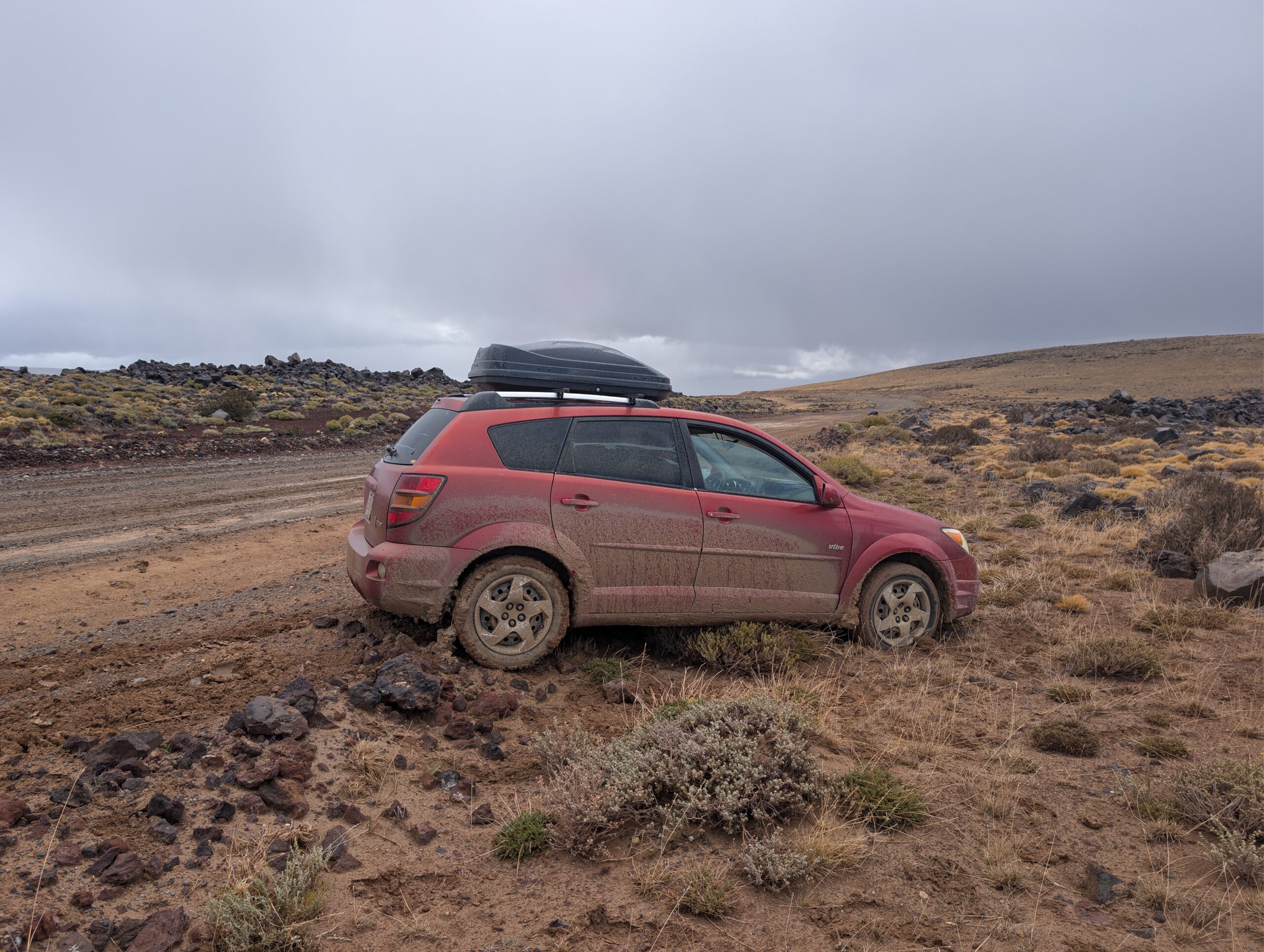 En quittant El Chaltén, nous avons pris la mythique Ruta 40. Ici, elle a l’aura de la Route 66 aux Etats-Unis. Beaucoup de motocyclistes et de voyageurs en Van la complètent, par aventure ou par défi, ou simplement afin d’y admirer les magnifiques paysages qui se succèdent. La route traverse le pays du Nord au Sud, en longeant la cordillière des Andes. Elle se tortille donc entre monts et pampas, et offre son bitume tant aux éléments météorologiques qu’à la faune, guanacos et émus principalement. Et je dis bitume, mais celui-ci ne couvre pas la totalité de la route. Certains tronçons semblent prêts à être terminés, mais sont loin de l’être, par exemple dû à des enjeux juridiques avec des propriétaires terriens. Malgré tout, nous avions fait nos devoirs, avions validé il y a longtemps que notre petit véhicule à 2 roues motrices avait les performances suffisantes à la traversée, et nous étions prêts. Nous en avons vu d’autres, quand même, notamment en Asie centrale avec notre fidèle golf 1998. N’empêche, un des adages lié à la Patagonie, c’est que la température peut changer rapidement, et beaucoup! Ainsi, nous avons entamé notre parcours d’un tronçon célèbre qui venait de recevoir une dose de pluie. Le fameux bout porte même un surnom. Lequel? « Los 73 malditos ». En français, nous les aurions donc surnommés les 73 maudits, ou damnés. Joli, non? On dirait presque le nom d’une plaquette de poésie. Poésie sûrement mélancolique et sombre, mais pleine de beauté quand même. Mais la ruta 40 ne porte ce nom que pour mettre en relief le bordel dans lequel on PEUT s’y trouver. Et trouvés, nous nous y sommes. En fait le sable qui se trouve à quelques endroits est si fin que, mélangé à de l’eau, se transforme presque en flaque de béton. Si vous y entrez, vous êtes mieux d’en sortir avant que le tout sèche et immobilise vos jantes dans le sol. Et c’est glissant, en plus….! Comme une belle étendue de glace noire québécoise! Une fois bien engagés au coeur des 73 kilomètres, nous avons appris que… la police empêchait les véhicules n’ayant pas un 4 roues motrices à s’engager… Oupsie… personne ne nous l’a dit, de notre côté..! Mais là, on y est, alors faut s’en sortir. On aura réussi, malgré une sortie de route et quelques frousses! Surtout que l’on avait prévu des aides à la traction et une pelle pour ce type de situation, mais ils avaient été volés à Buenos Aires des semaines auparavant. Mais, défi relevé!