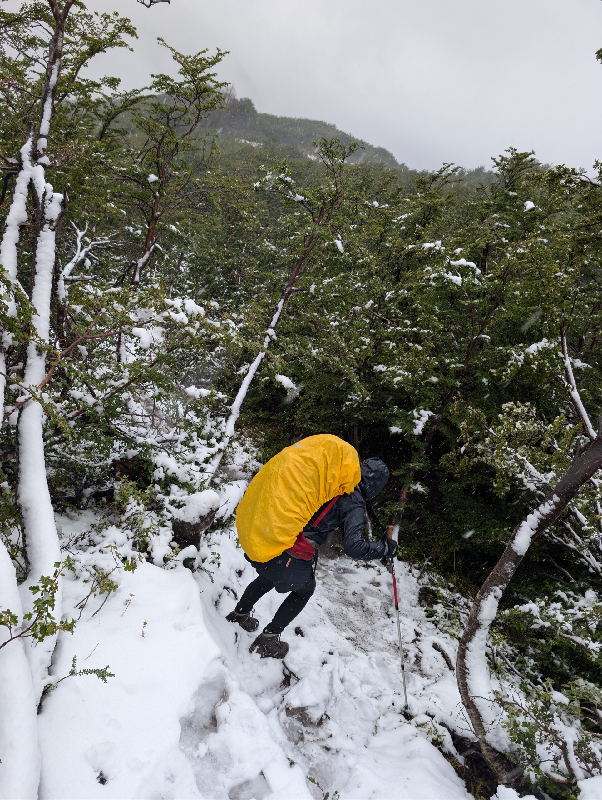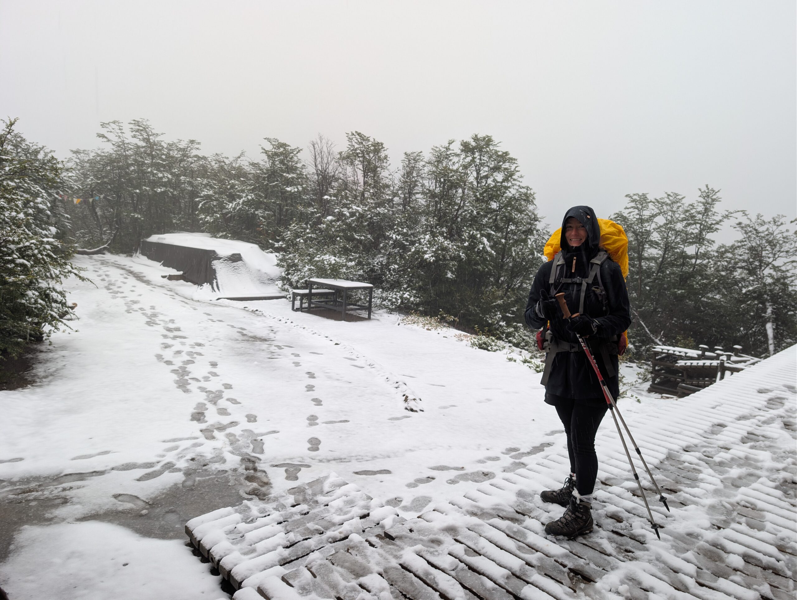 À un moment, je réalise que mon imperméable a abandonné. M’a carrément laissée tomber. Il est maintenant perméable. C’est donc après seulement quelques heures de randonnée que nous sommes mouillés, tous les deux, de la tête aux pieds, tellement la pluie est présente. Et les degrés commencent à s’égrainer… nous commençons à avoir tellement froid, que de seulement s’arrêter pour manger ne semble pas être une option. Nous n’avons même pas faim, de toute façon. Et quelques kilomètres plus loin… la pluie se transforme. De la grêle, puis de la neige. Nous sommes donc dans les sommets de montagnes, mouillés, transis, sous la neige, et plusieurs kilomètres sont encore devant nous avant de rejoindre le prochain refuge. Et là, il devient certain que nous allons nous y arrêter plutôt que d’utiliser notre tente. Nous lui donnerons ses lettres de noblesse de “refuge”, parce que c’est réellement ce rôle qu’il prendra pour nous. Et la randonnée demeure difficile, glissante, froide, et ma jambe blessée au cours des dernières randonnées me tiraille et me fait faire de faux mouvements. Antoine et moi entrons donc en mode survie. Pas parce que nos vie sont actuellement en danger, non. Car nous savons que nous avons une tente en cas d’urgence, que nous avons des vêtements secs, bien emballés dans des sacs imperméables (pour vrai, eux), et que nous avons suffisamment de nourriture et d’eau pour durer. Nous sommes donc bien préparés malgré tout.