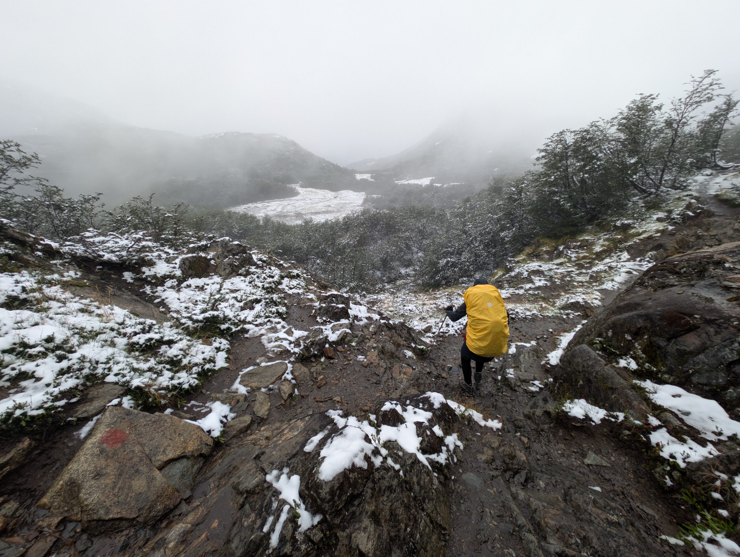 Nous sommes donc redescendus vers notre auto (et son chauffage), toujours dans la pluie, la bouette et l’humidité à 100%. Mais là au moins, la neige ne nous aura pas surpris, nous la savions présente. Et le souper, de retour à Bariloche, fut digne des plus grands banquets!