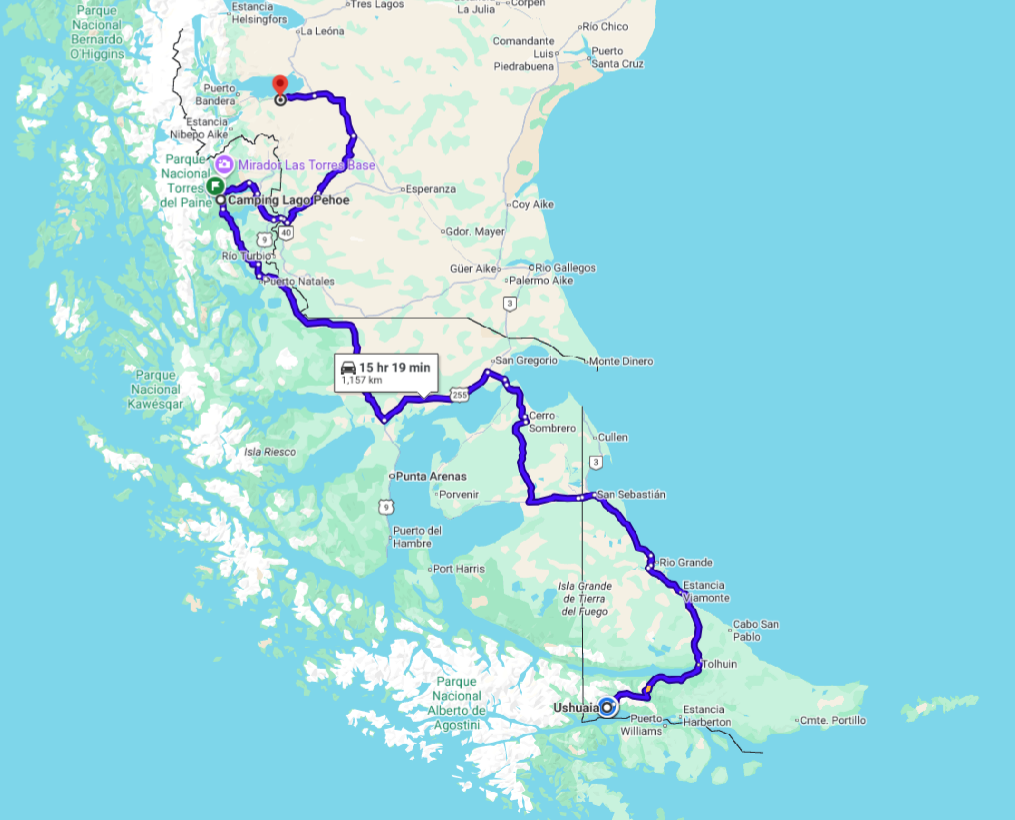 Nous avons mis 2 jours de route à nous rendre à ce parc. Son plus grand attrait est sans conteste la randonnée, dont notamment la mythique W : un itinéraire d’environ 75km que les gens font sur 4 ou 5 jours, en trimballant leur sac à dos de refuge en refuge. Au menu, glacier, montagnes, vent, eaux turquoises, tout s’y trouve. Par contre, ce trek est très prisé et il doit être réservé des semaines voire des mois à l’avance. Toutefois, nous avions la possibilité de camper de l’autre côté du lac et de s’y rendre à la journée en petit bateau, ce que nous avons fait. Nous avons donc fait 3 jours de randonnée, en priorisant les plus belles sections et en en couvrant la grande majorité. Vu que notre façon de faire occasionnait quelques fois de revenir sur nos pas, nous avons justement fait un 75 km de marche sur trois jours. On s’est donné une bonne claque, comme on dit. Mais la qualité du sommeil qui vient avec cela!