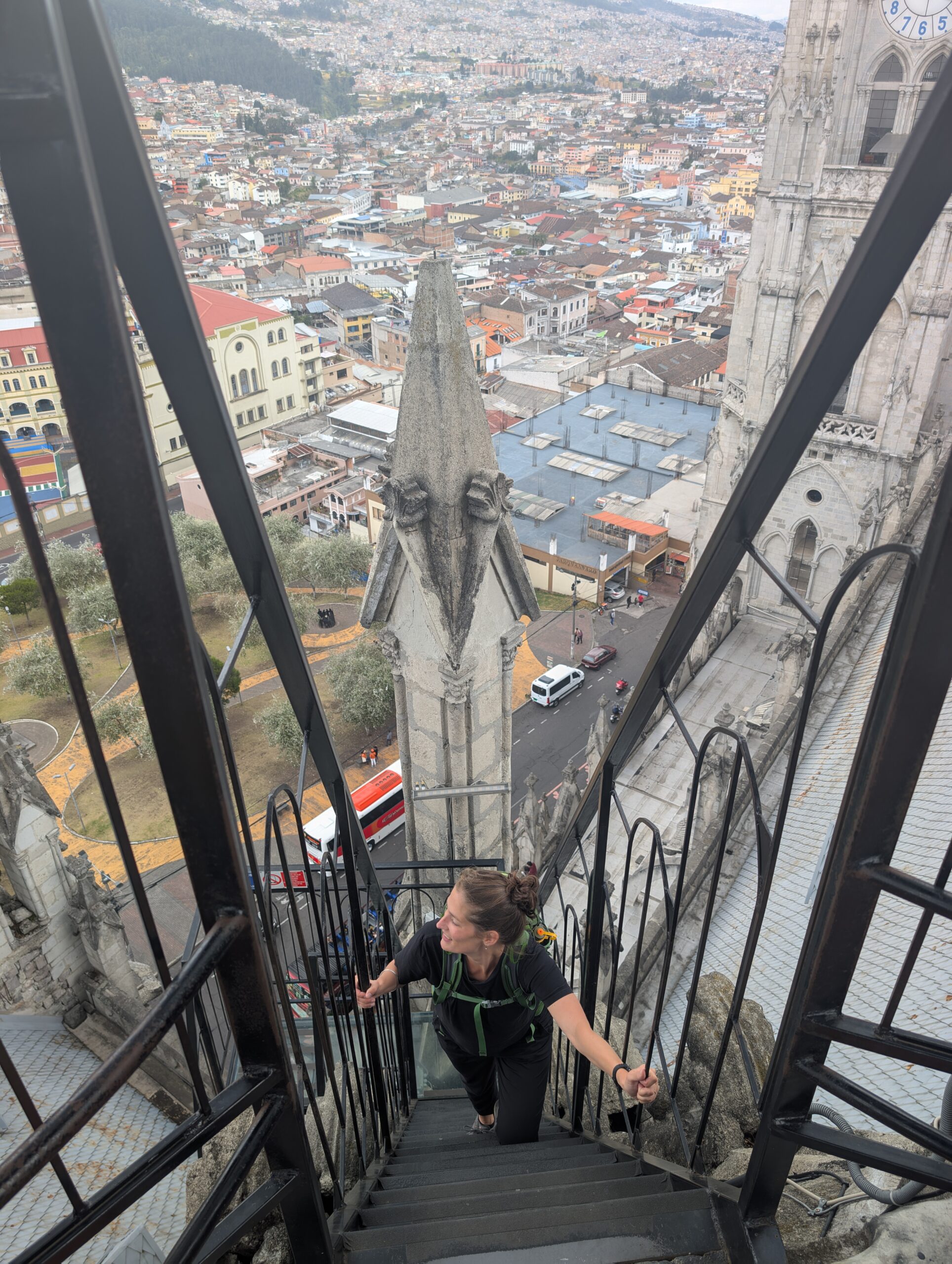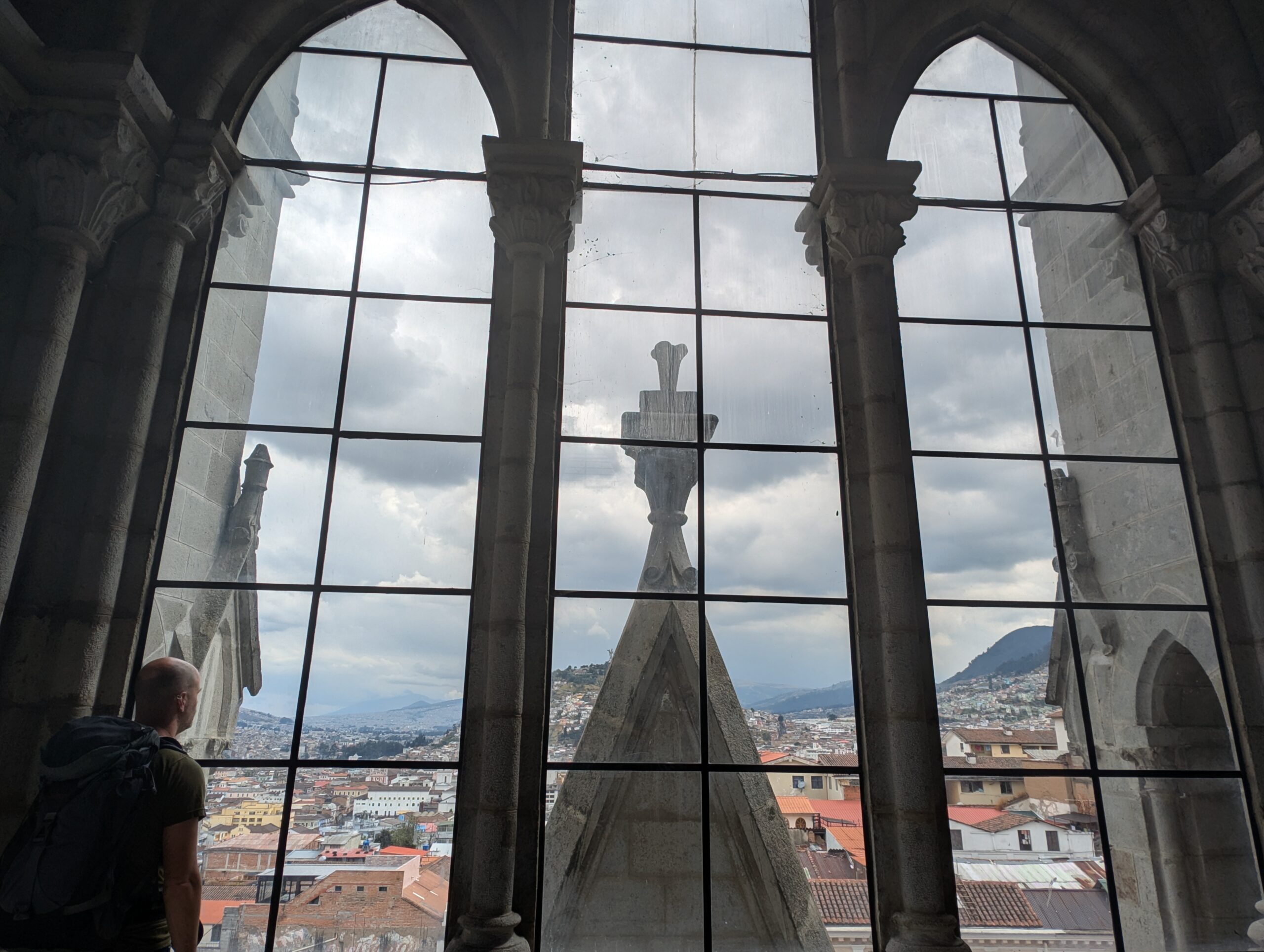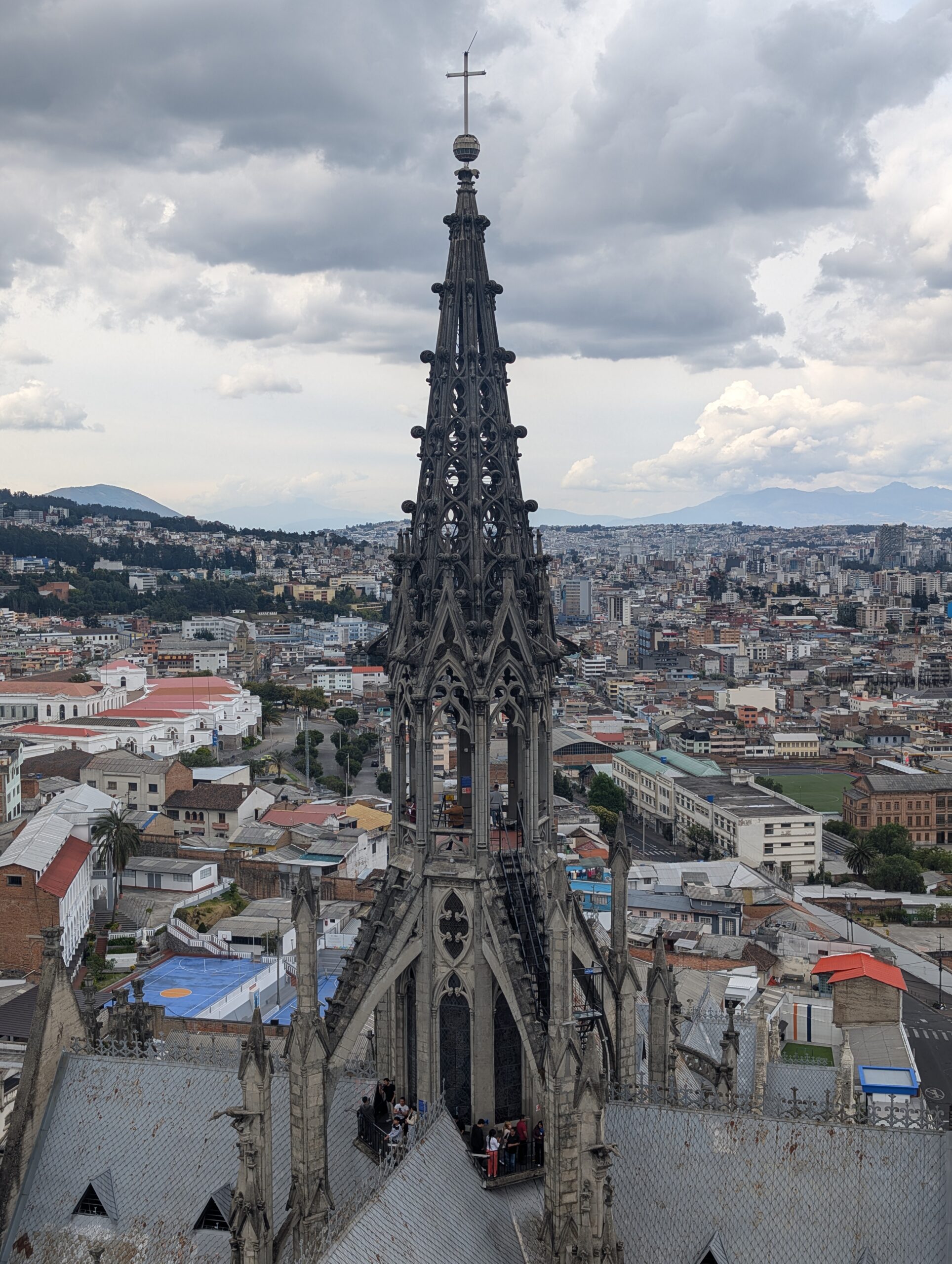 La belle Quito se marche, en long comme en large, et même en hauteur. Et un peu partout sont saupoudrées des clochers d’église. L’une d’elle, par aileurs, est très impressionnante. Sa construction a débuté vers 1892 et a été inaugurée en… 1988. Elle a un style gothique époustouflant, mais sa petite jeunesse la rend un peu hors normes. De plus, actuellement, son enceinte est entièrement utilisée à la construction… d’une immense crèche. Il est toutefois possible de la monter, ou la grimper, plutôt, jusqu’à l’un de ses clochers. Accrochés à de petits escaliers de métal, au grand vent des montagnes, l’expérience est sportive! La vue du haut vaut l’effort.