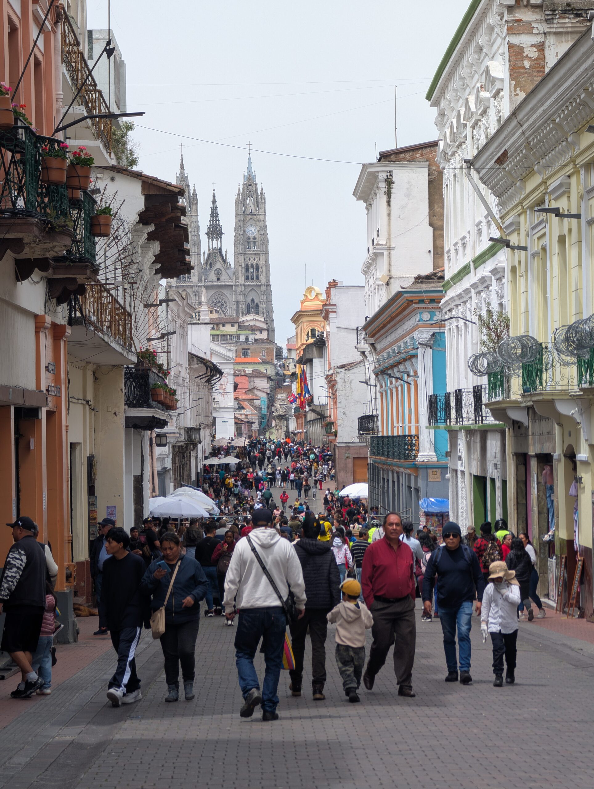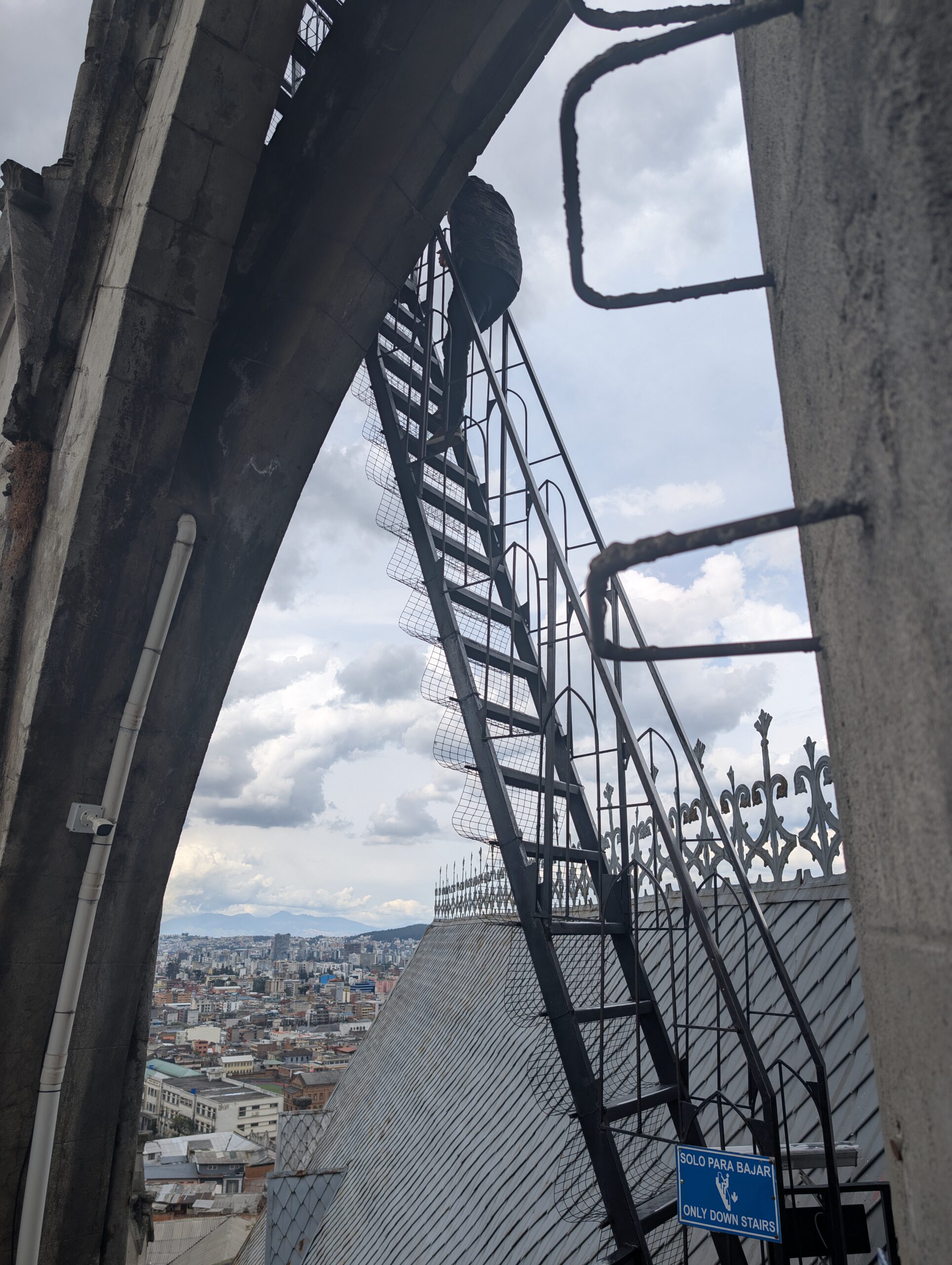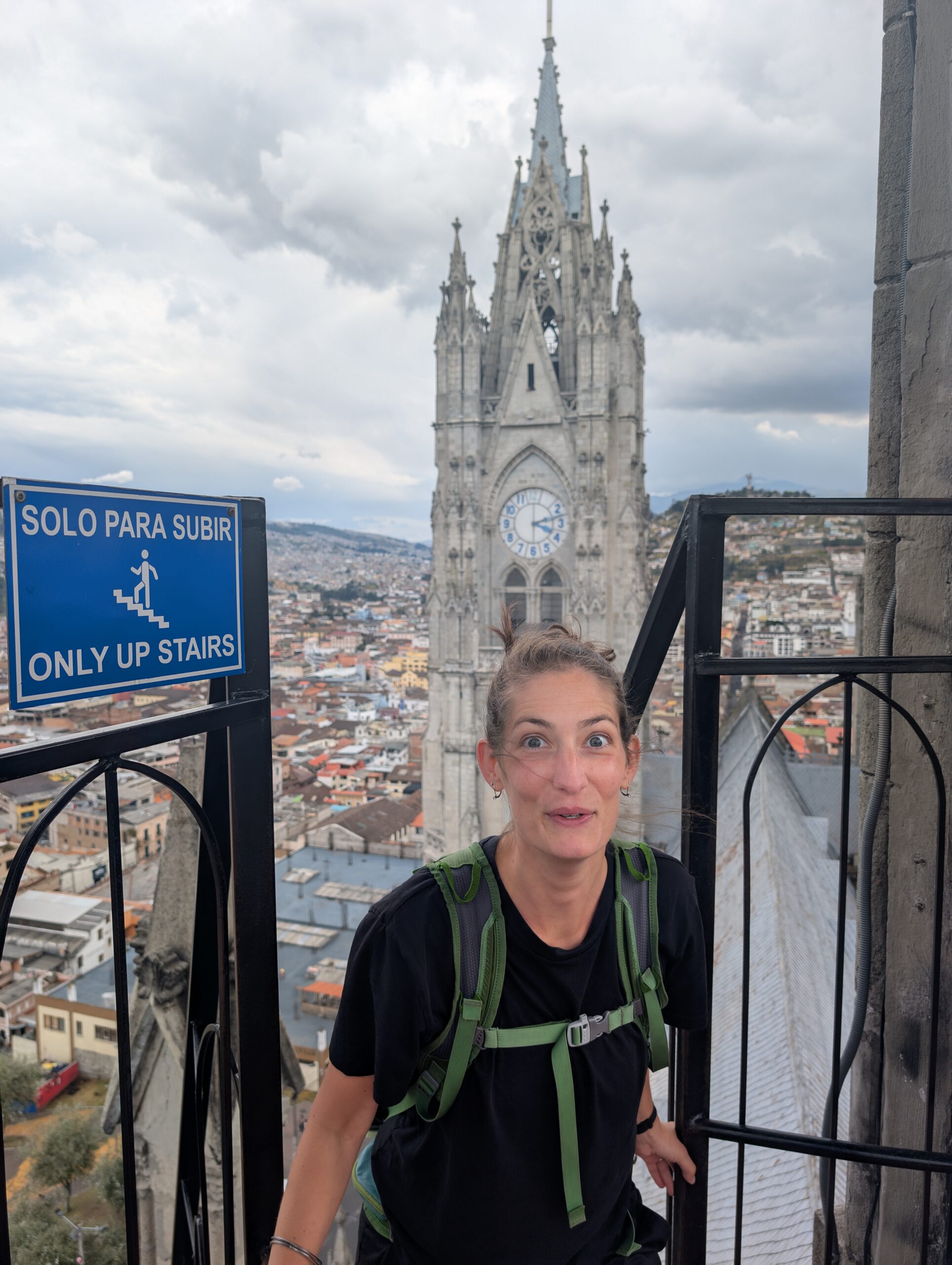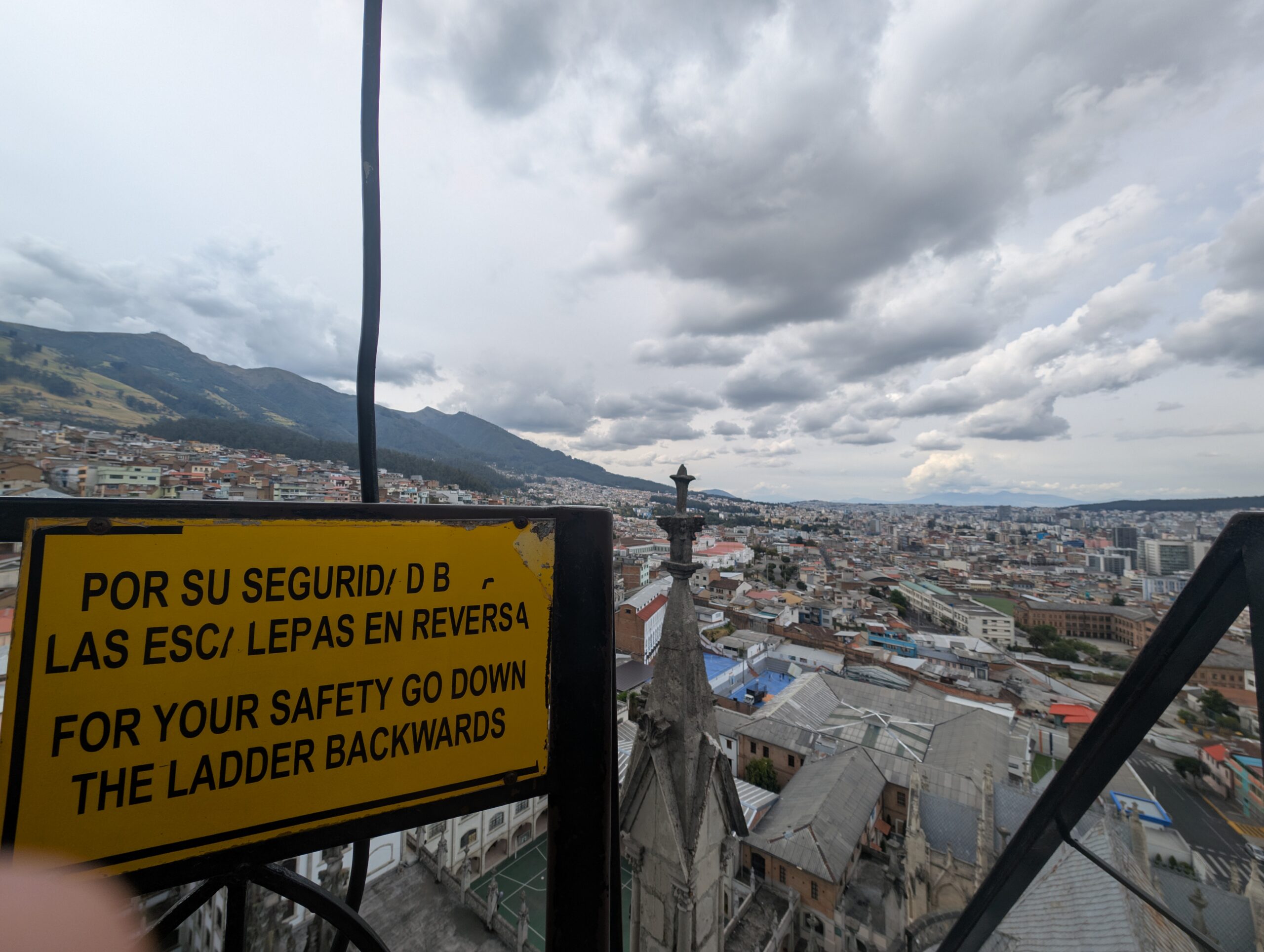 La belle Quito se marche, en long comme en large, et même en hauteur. Et un peu partout sont saupoudrées des clochers d’église. L’une d’elle, par aileurs, est très impressionnante. Sa construction a débuté vers 1892 et a été inaugurée en… 1988. Elle a un style gothique époustouflant, mais sa petite jeunesse la rend un peu hors normes. De plus, actuellement, son enceinte est entièrement utilisée à la construction… d’une immense crèche. Il est toutefois possible de la monter, ou la grimper, plutôt, jusqu’à l’un de ses clochers. Accrochés à de petits escaliers de métal, au grand vent des montagnes, l’expérience est sportive! La vue du haut vaut l’effort.