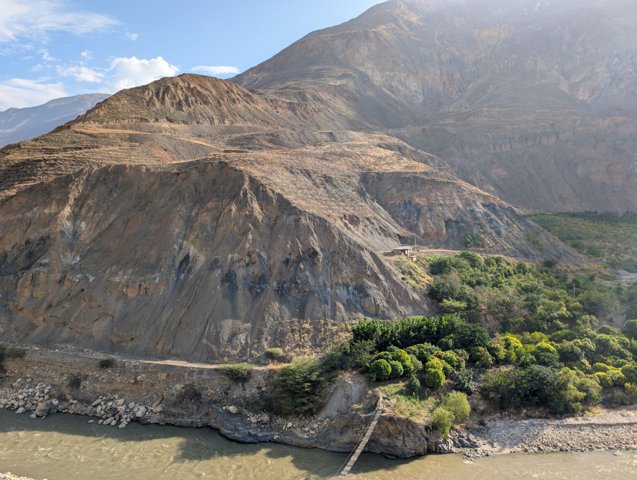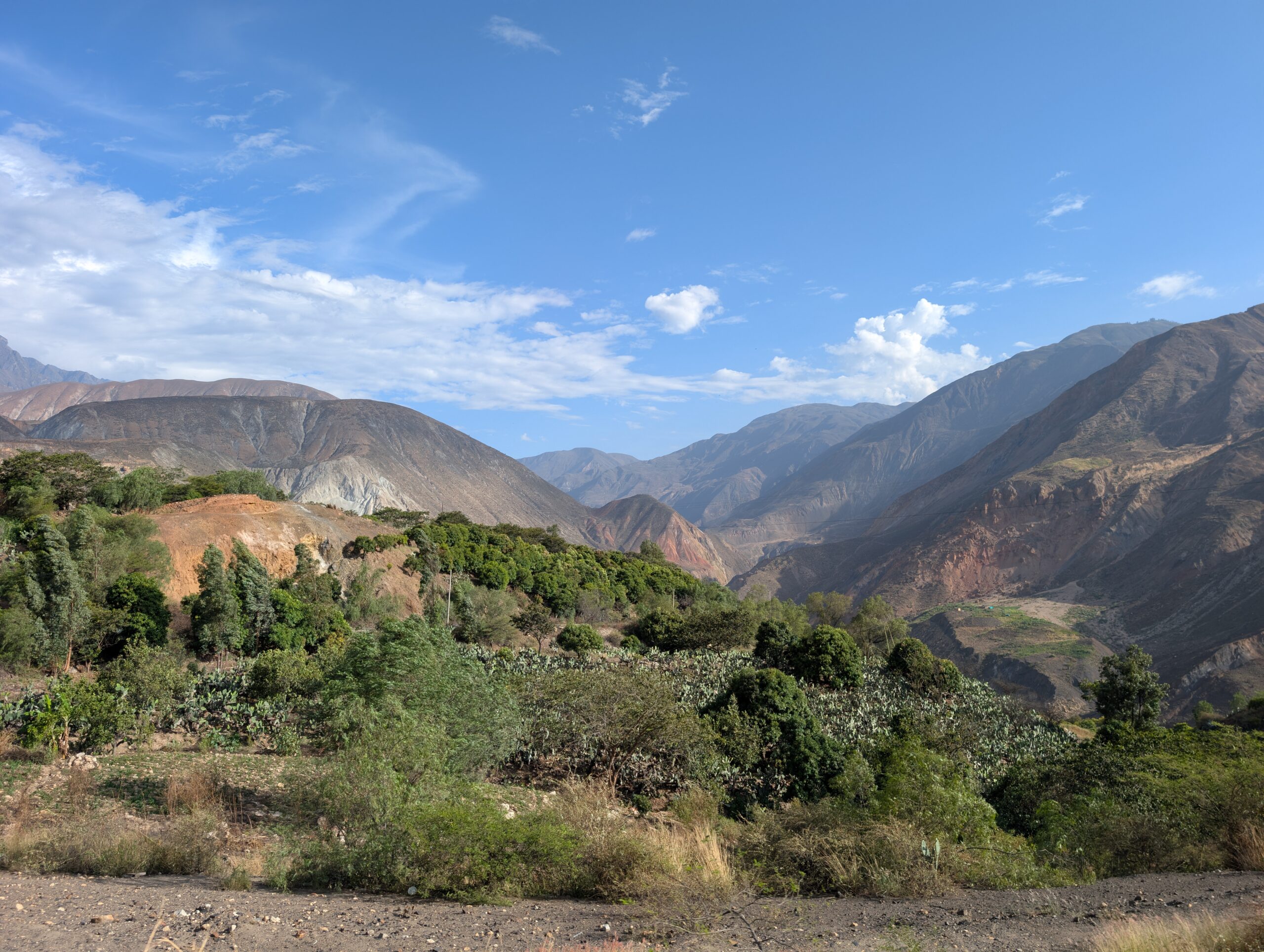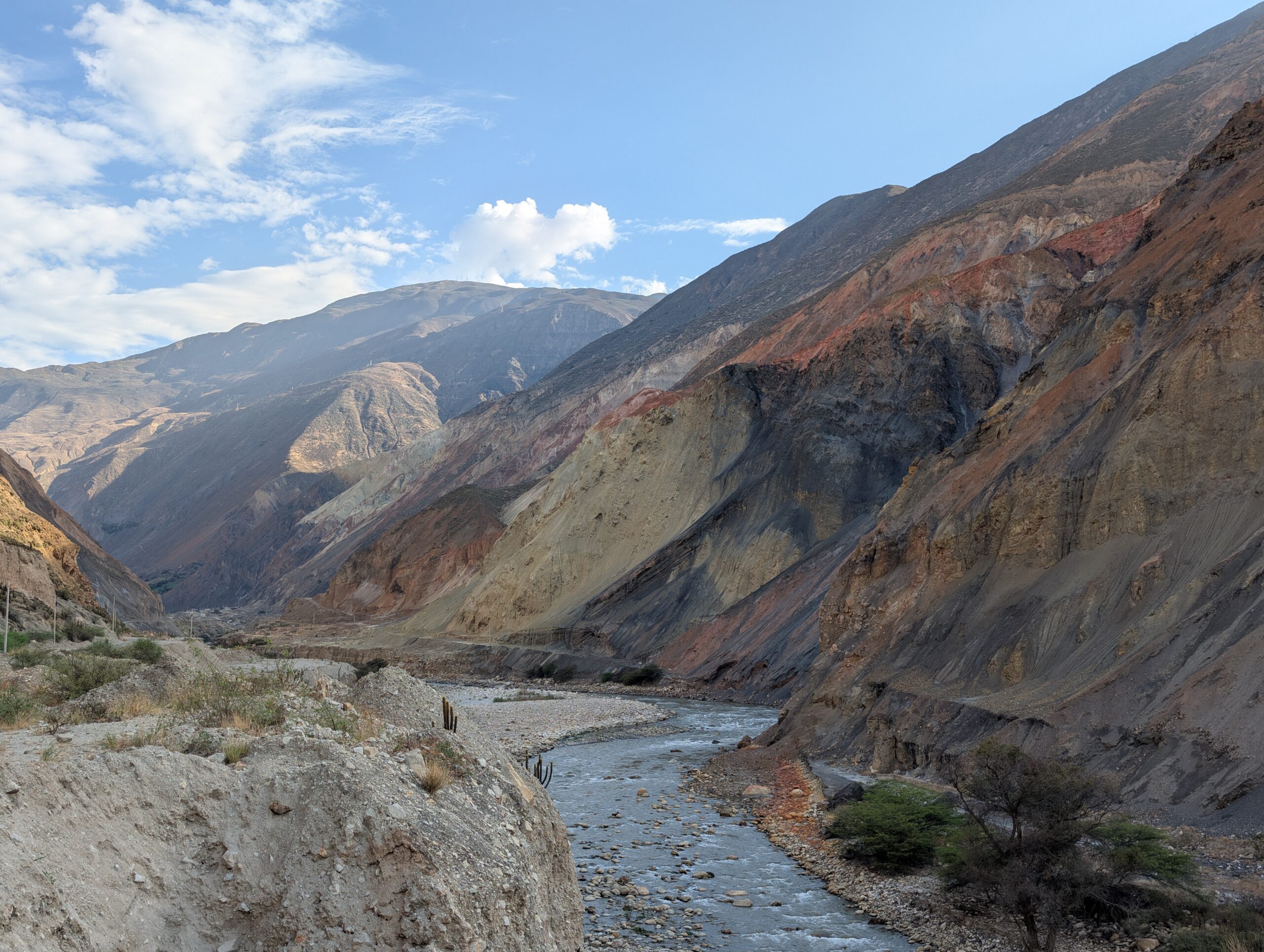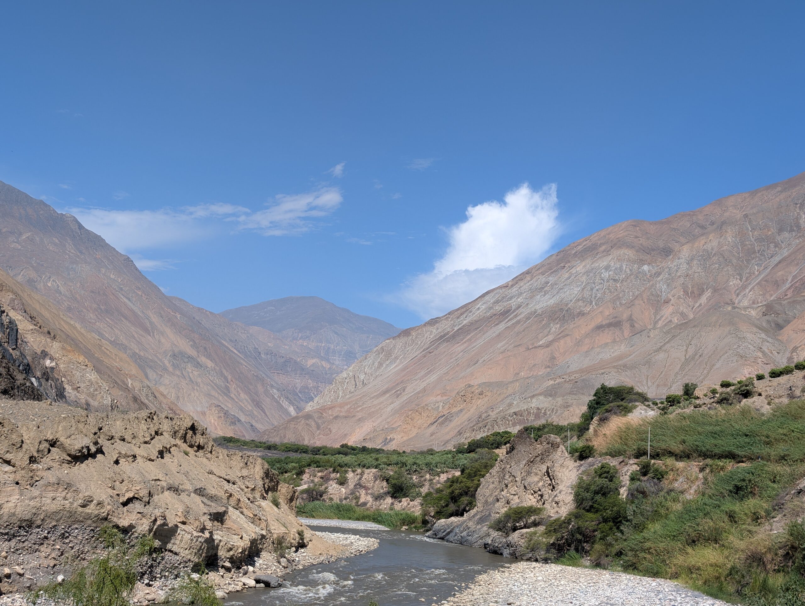 Cette cordillère, au coeur même de celle des Andes, prête à la rêverie et à la contemplation. La route pour s’y rendre depuis la côte, déjà, est à couper le souffle. De grandes montagnes rocailleuses, qui daignent laisser une vallée se réchauffer et se verdir, permet à de petits hameaux de s’y établir et de cultiver riz, légumes, fruits. Un peu plus loin, la verdure a presque complètement perdu son ancrage, mais on remplace les activités de subsistance par les mines à charbon. L’espace se rétrécit à un moment pour que l’on traverse le Canyon del pato, où la route nous accompagne au travers d’une multitude de tunnels creusés à même le roc, où reculer est une manoeuvre parfois nécessaire pour pouvoir continuer.