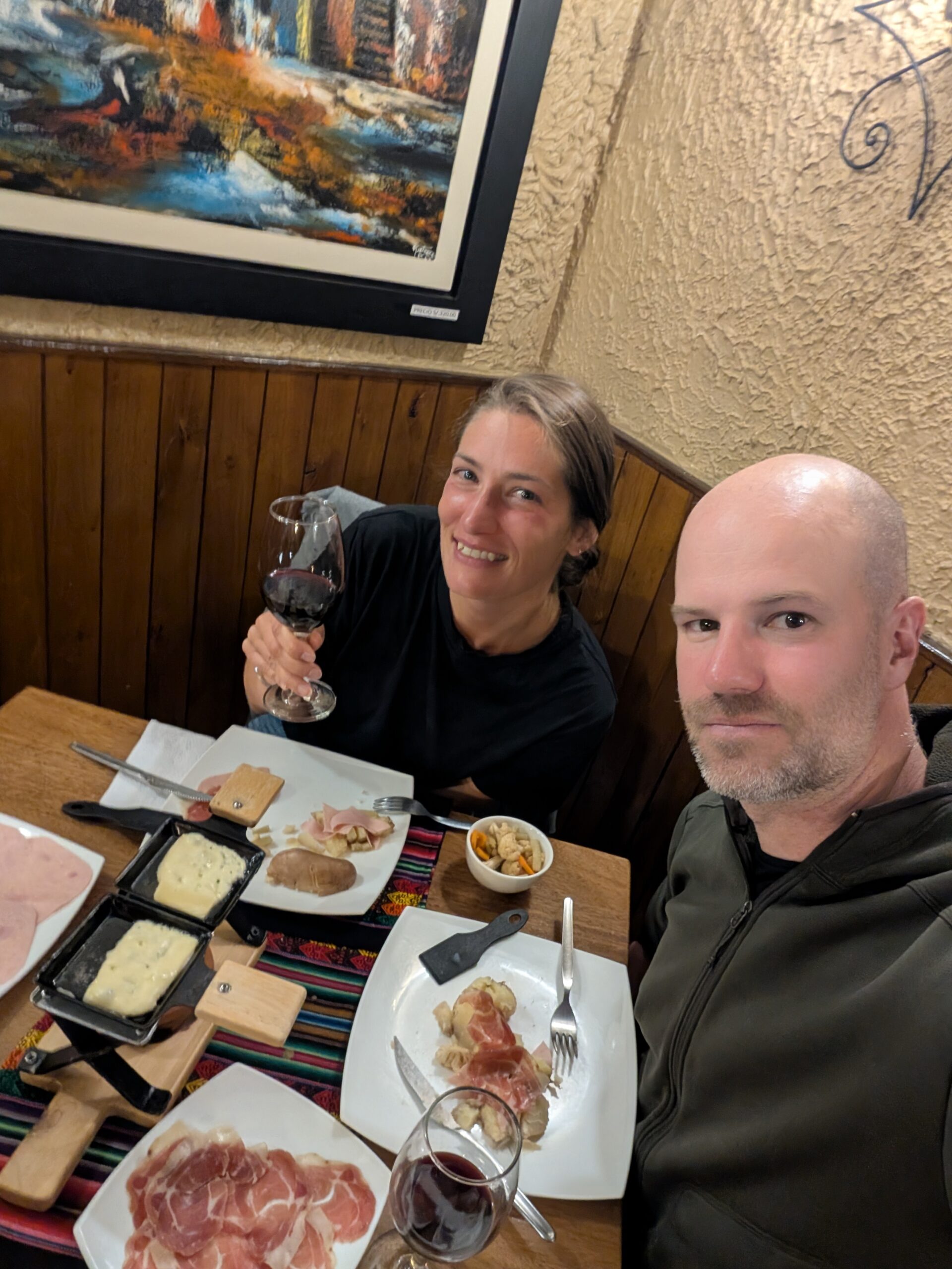 Ainsi, après cette journée qui nous aura rougit les joues et accentué le sourire, nous sommes arrivés dans cette ville, reconnue comme la plus touristique de la région. Elle l’est en effet, et bien qu’elle ne soit pas déplaisante, elle me semble surtout être un centre d’où partent les randonneurs. Une surprise que nous y avons trouvé, toutefois, fut un souper de… raclette! Une fois de temps en temps, se rappeler les doux soupers entre amis ou en famille à la maison… juste cette image réchauffe le coeur.