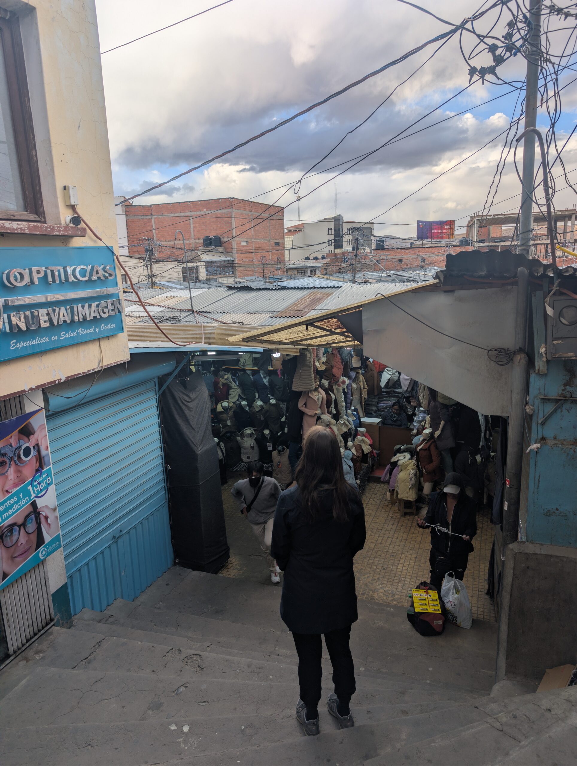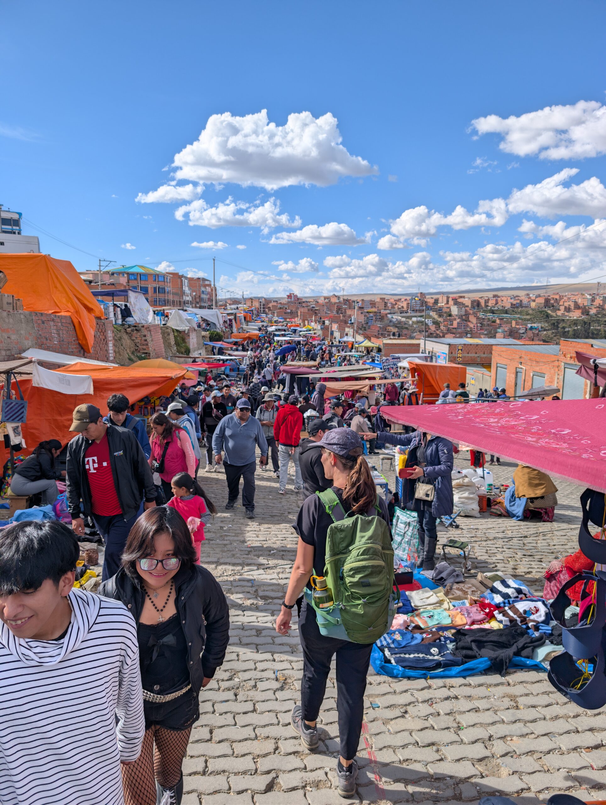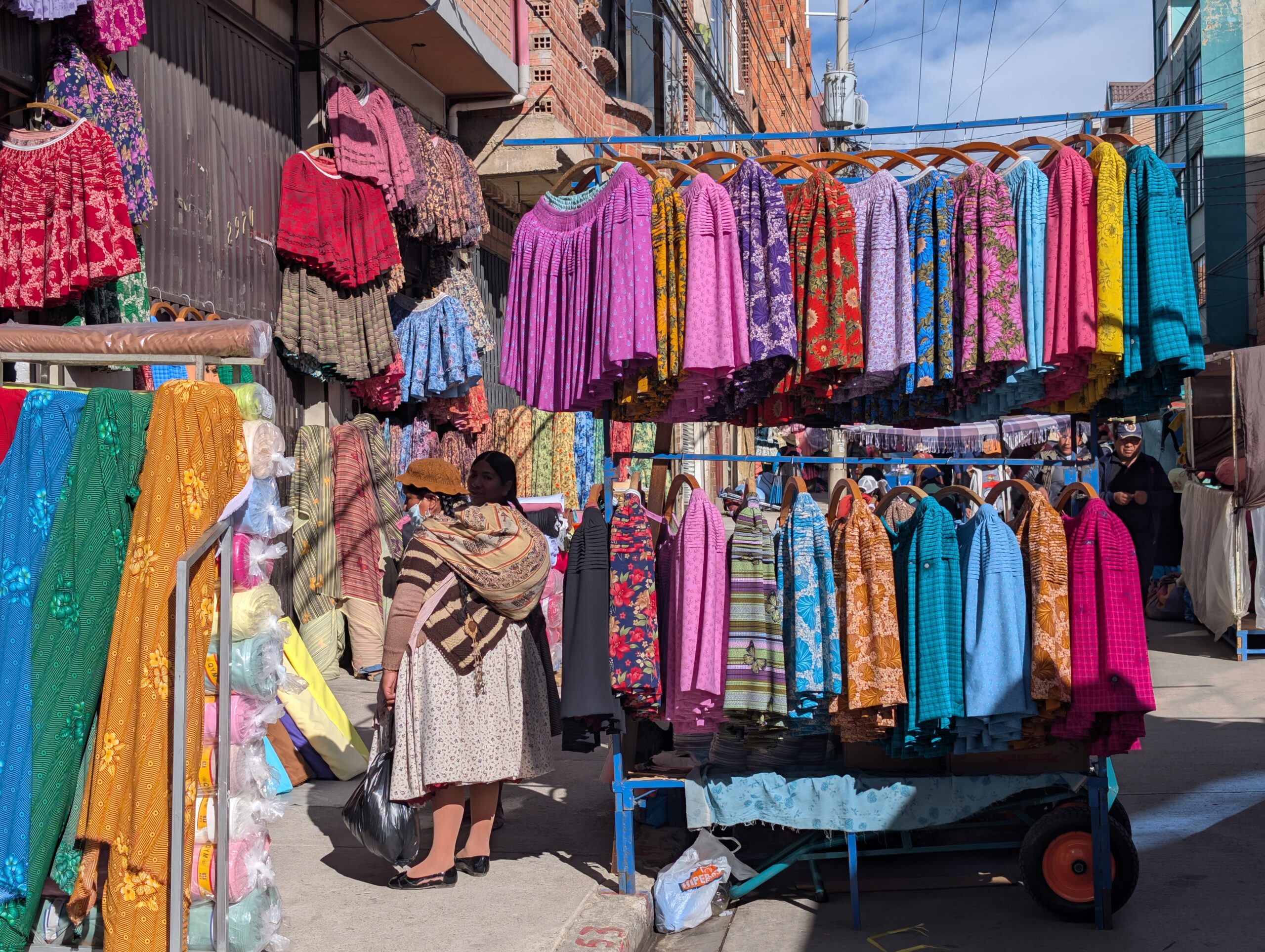 La Paz est un mélange entre Medellín et l’Inde: l’enveloppe architecturale rappelle cette magnifique ville de Colombie, alors que l’effervescence et la densité de population rappelle l’Inde. Lors d’une journée de marche, nous sommes remontés par téléphérique vers les hauteurs, appelées El Alto, afin d’en faire un petit tour sur son bord pour redescendre à pied vers le centre de la ville. Et bien, nous nous sommes retrouvés dans un marché, qui aura grignoté des kilomètres et des kilomètres de rues. Ici, vous pouvez tout trouver. Nourriture, vêtements, pièces de voiture, tout. Neuf ou usagé. Et ce qui donne une couleur, ma foi, colorée… ce sont les cholitas. Depuis plusieurs pays nous croisons des femmes dignes, parées pour de grands événements même pour aller au champs, mais ici, on a rajouté une couche. Littéralement, car les femmes, surnommées cholitas, portent plusieurs couches de tissus en guise de jupe, accentuant de façon artificielle la courbe de leurs hanches. Un symbole de fertilité, qui leur est parfois difficile de faire passer entre deux tables. Ces jupes bouffantes auraient apparemment été, selon notre guide, adoptées par les femmes autochtones en modèle des Espagnoles qui arrivaient par bateau à l’époque de la colonisation, avec leurs amples robes de la Renaissance. Leur chapeau melon viendrait également de cette colonisation. Ces femmes ont longtemps été stigmatisées, mais ce terme qui était initialement péjoratif est maintenant un symbole de fierté et d’affirmation. Elle embrassent tous ces symboles, qui sont ironiquement intimement liés au passé colonial de la région.