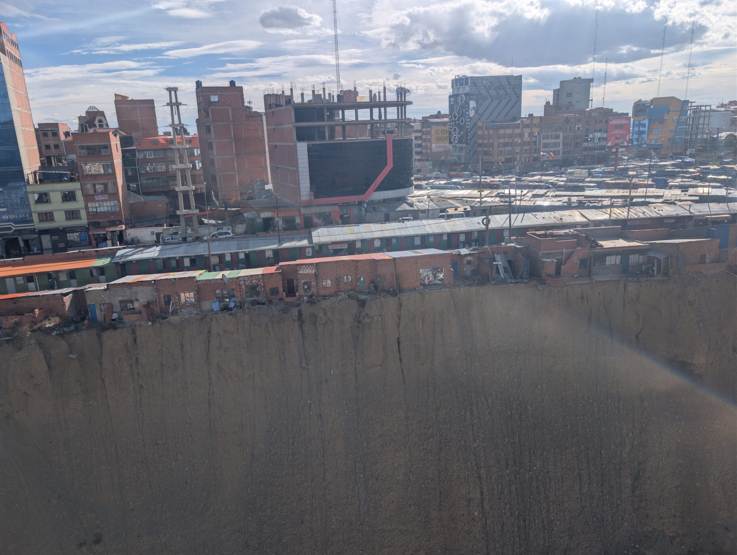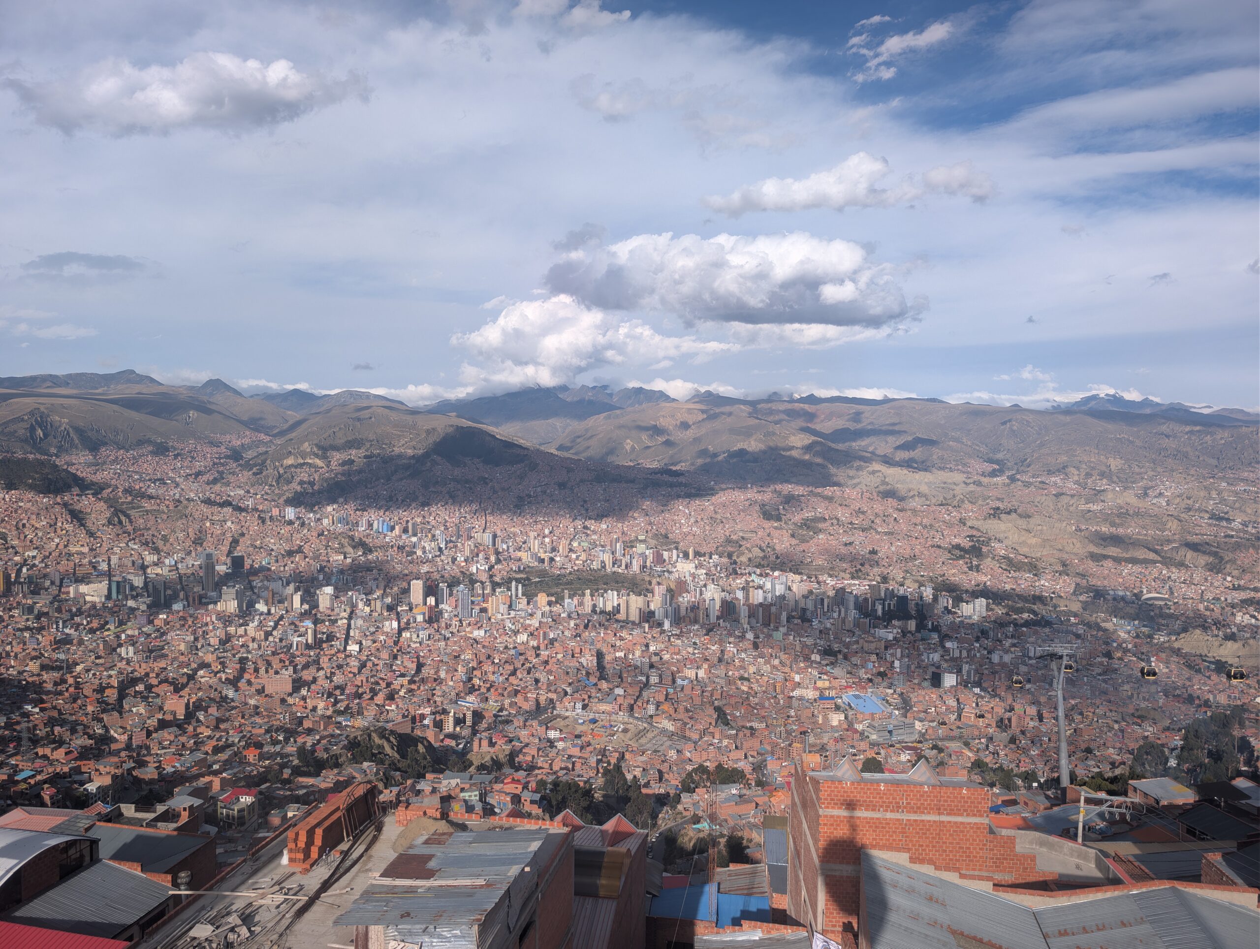 En quittant le Pérou, nous avons fait plusieurs kilomètres dans l’Altiplano, cette vaste plaine qui s’étend sur environ 1500 kilomètres. Elle débute au Pérou justement, traverse la Bolivie et descend jusqu’au Chili et à l’Argentine. Cette plaine est en altitude (en moyenne 3800 mètres). En y roulant, on croise donc beaucoup d’herbes de la Pampa, quelques villages et du bétail. A un moment, la densification urbaine se fait sentir, mais nous ne voyons que les maisons de briques collées se multiplier devant nos yeux jusqu’à des pics montagneux au loin. Et soudainement, la plaine laisse place à un immense creux, entre elle et les montagnes. Comme si la terre avait fondu pour retourner vers son noyau, et partout la surface est recouvertes de maisons et d’immeubles. Et la ville n’est pas de tout repos, car de multiples collinettes jalonnent son fond et ses parois, essoufflant tant les marcheurs que les voitures. Car tous deux sont touchés par la pente en altitude! Une solution est clairement présente, soit le transport en commun. D’une part, une quantité surprenante de vagonettes à une dizaine de passagers déplace les gens du nord au sud, et du fond à la surface. En plus, un réseau de téléphériques que je comparerais au métro de Montréal dans son étendue, joint l’utile à l’agréable.