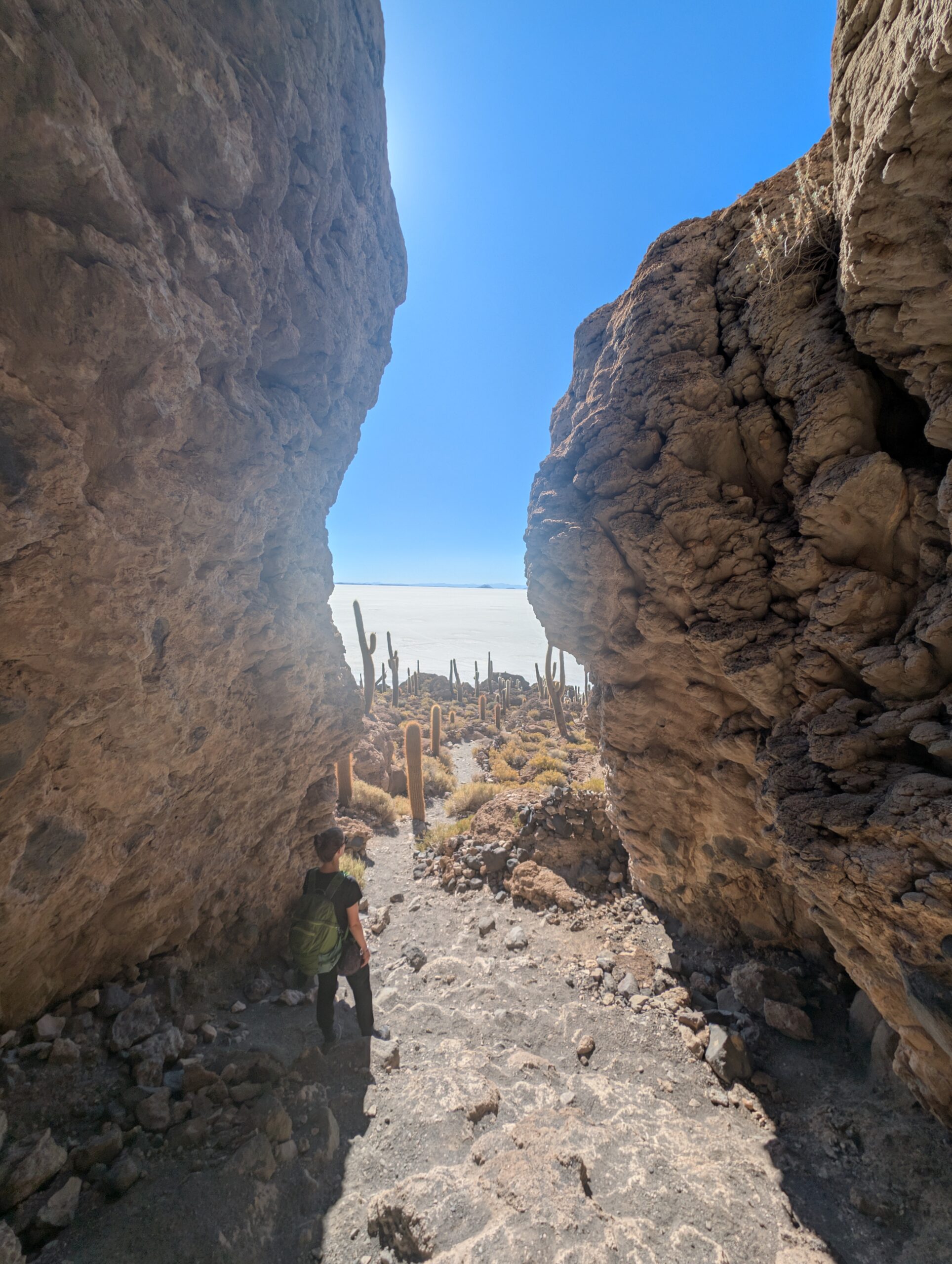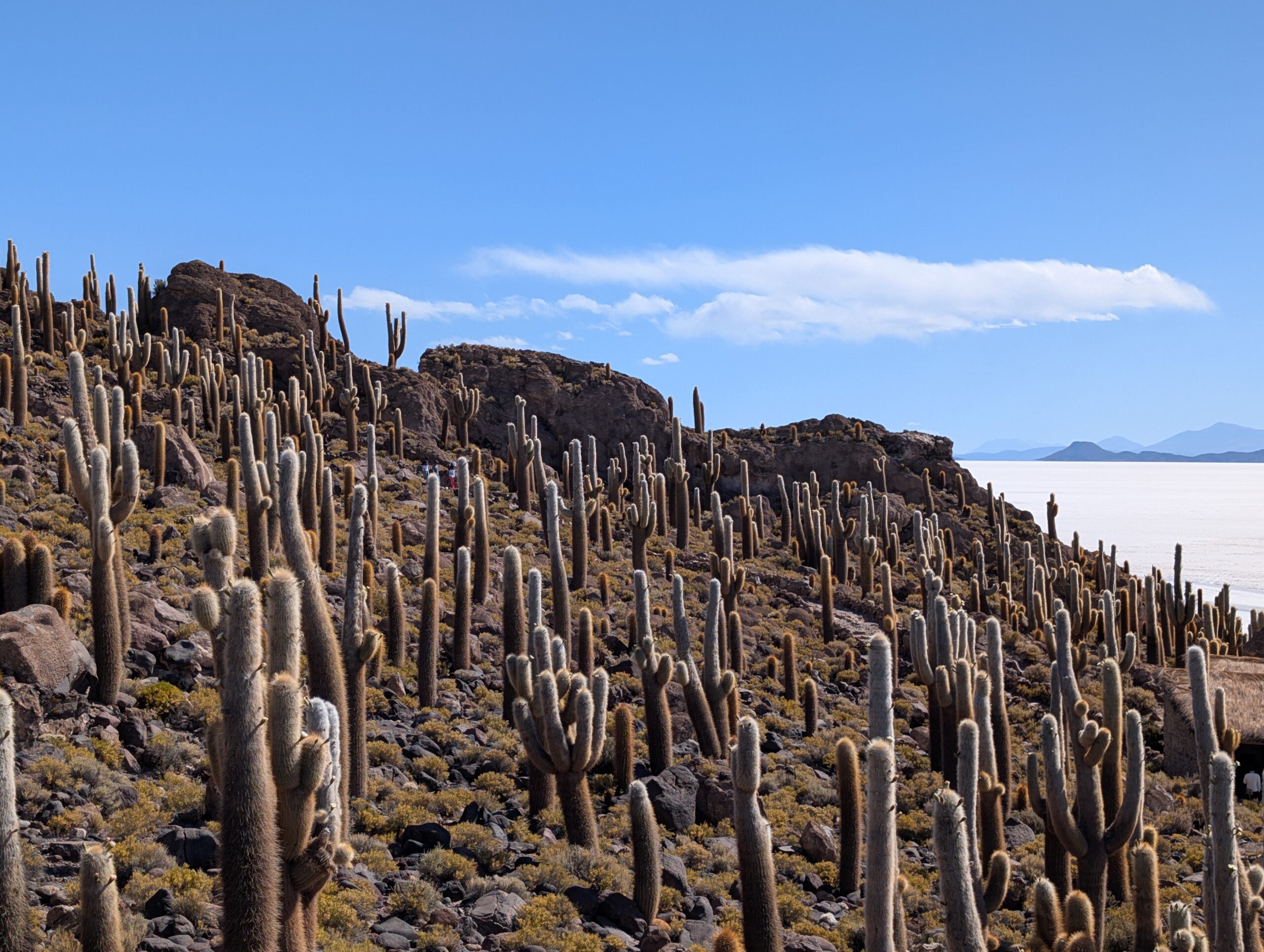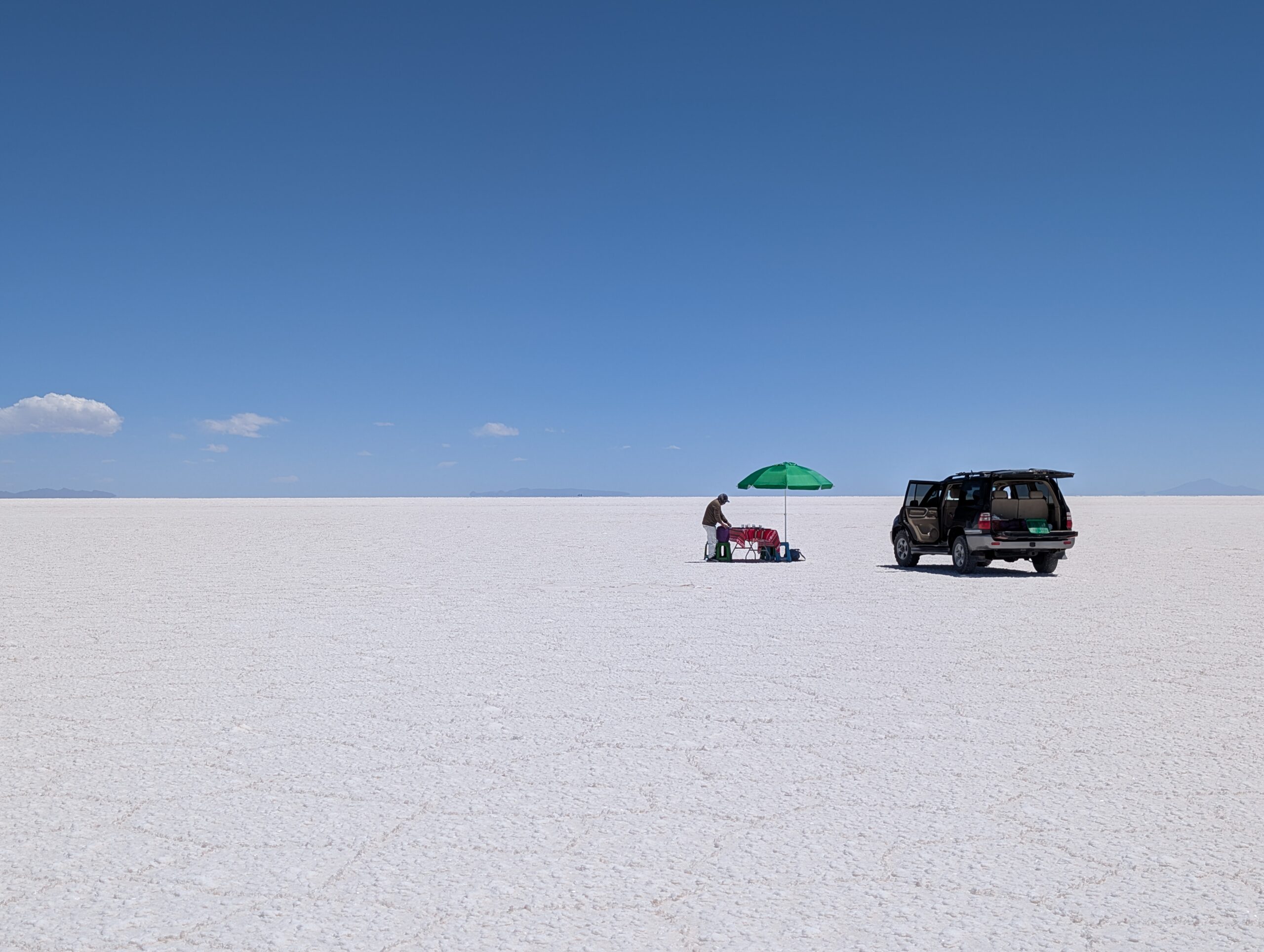 Cet endroit est probabement l’un des plus visité, celui qui fascine les voyageurs de tous types. Une immense étendue de… sel. À perte de vue, parfois recouverte d’une légère couche d’eau la rendant aussi réflective qu’un miroir, selon la saison. Il est vrai que de se promener des heures dans un véhicule qui fend le vent où l’on ne peut que contempler une autre merveille créative de la Terre, ne peut qu’être méditatif.